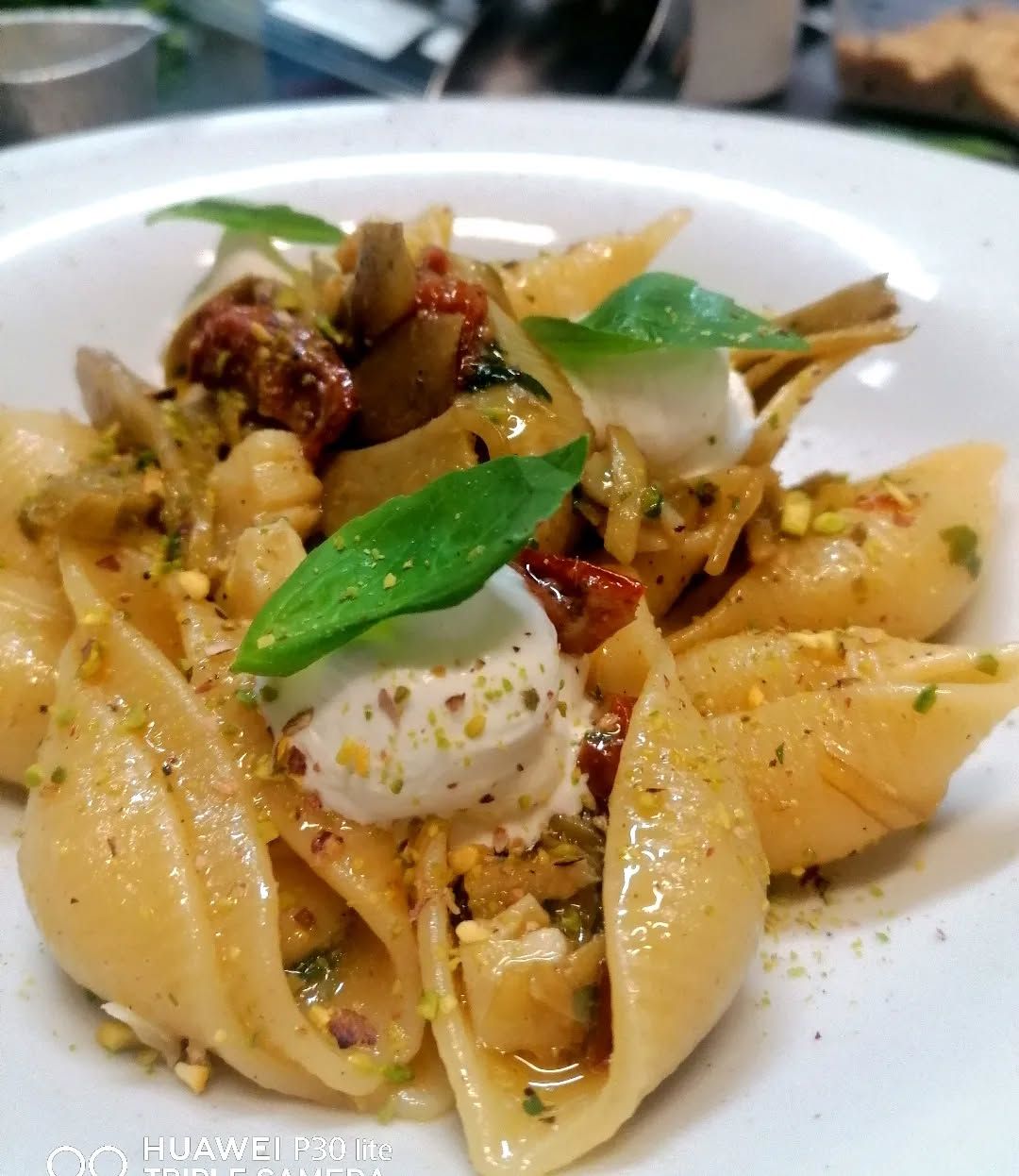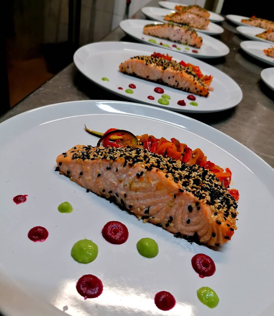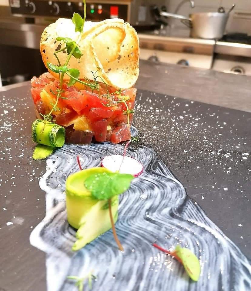 I primi includono lo spaghettone cacio e pepe con fave e guanciale, i paccheri alla puttanesca di tonno e i ravioli alpigiana con rapa rossa e salmone. Tra i secondi, tagliata di vitellone, polpo grigliato e coppa di maialino da latte, nigiri con panzanella all’avocado.