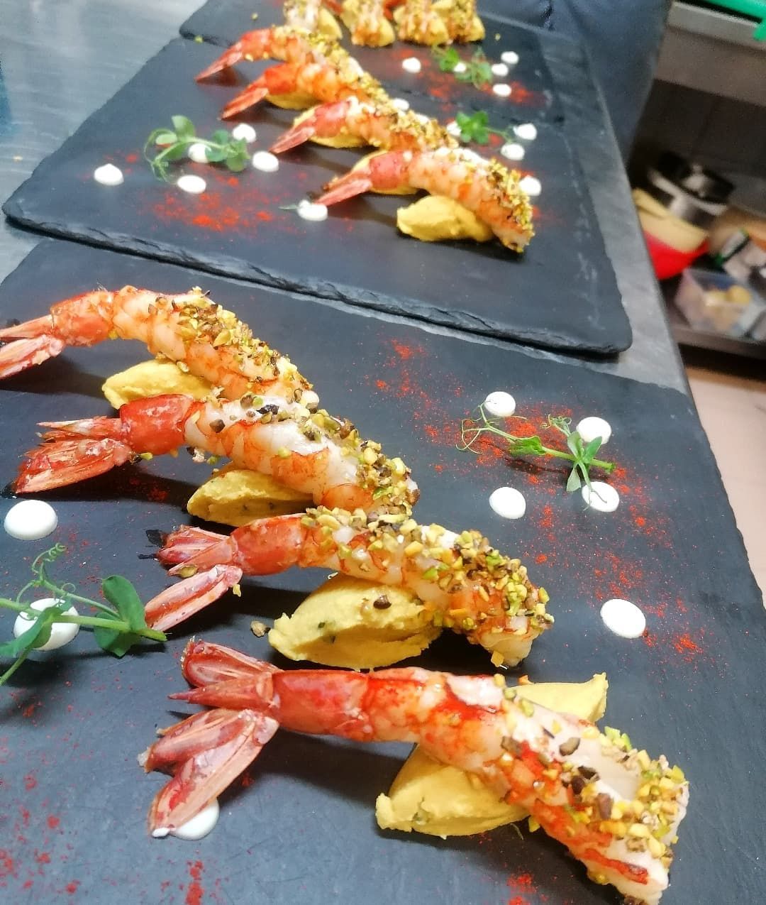 Tra gli antipasti spiccano la selezione di salumi e formaggi, le bruschette, i gamberi argentini marinati al lime su hummus di ceci, il paté di fegato in vasetto e la battuta di fassona.